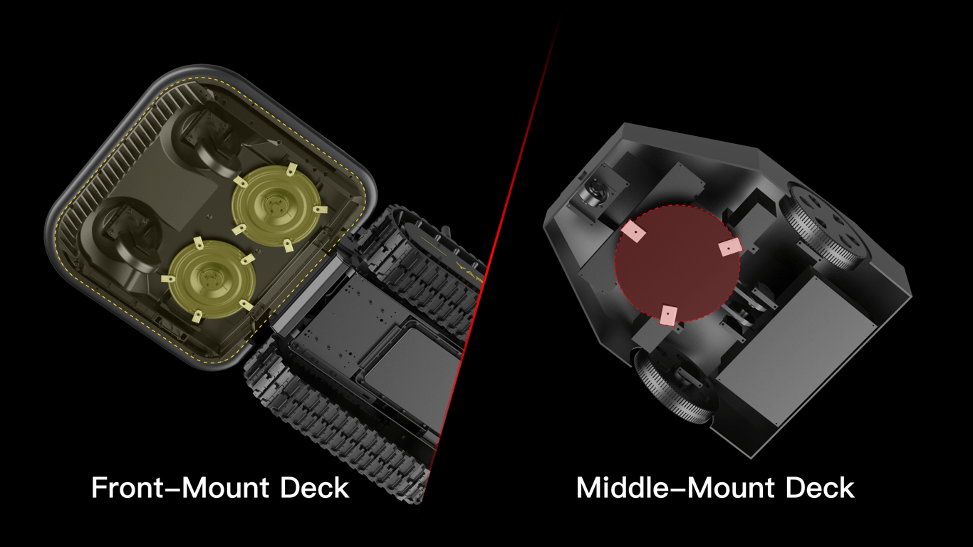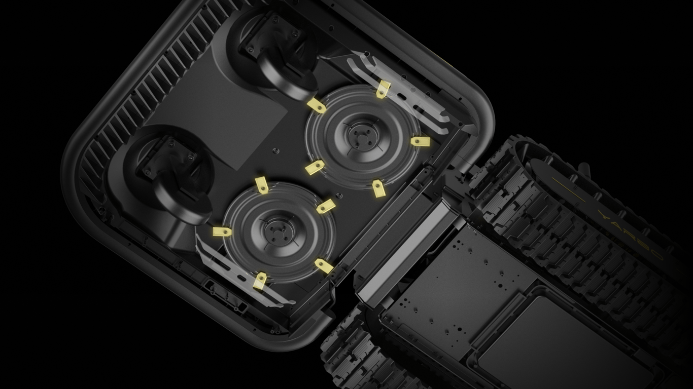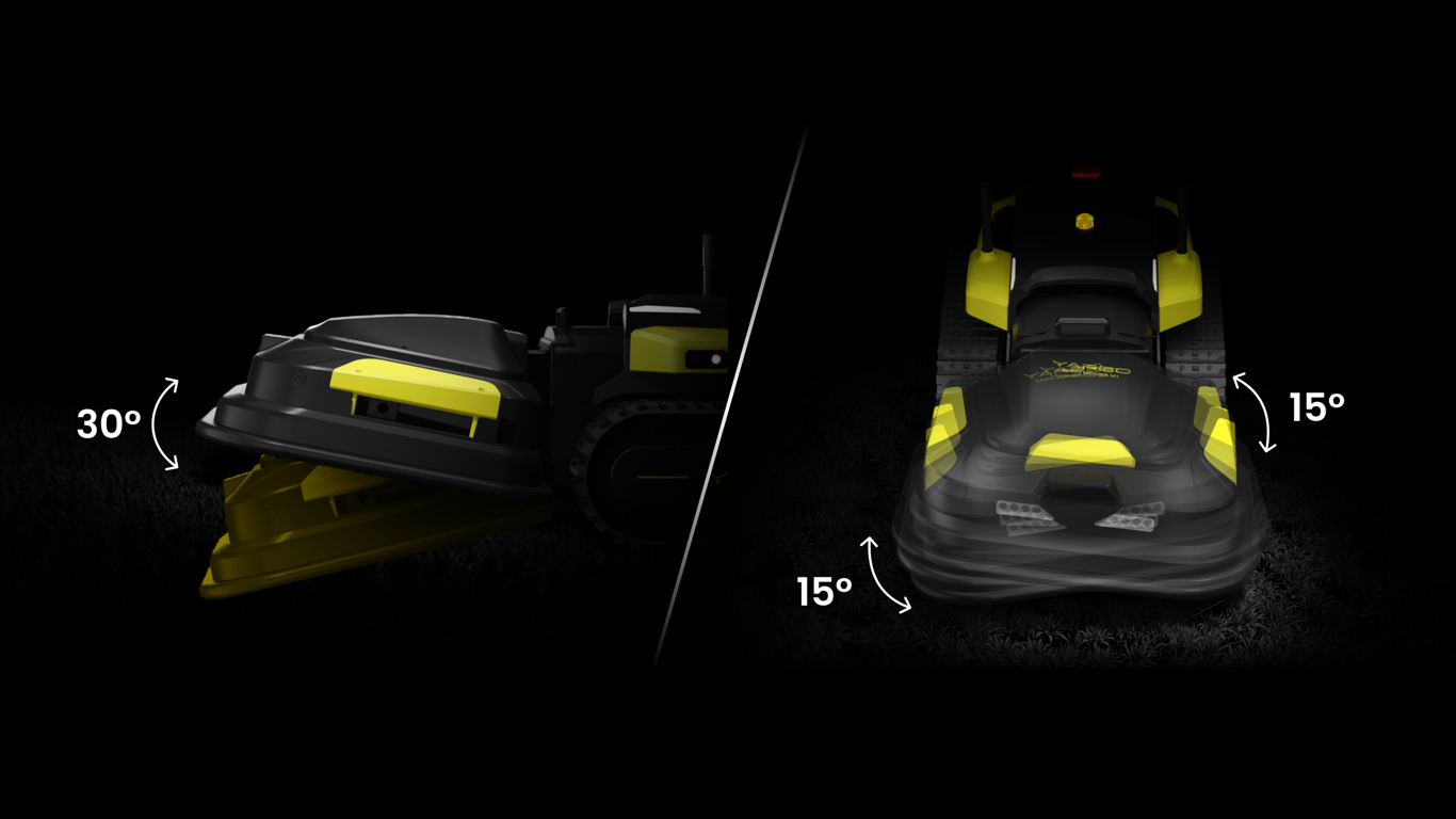 Yarbo's flexible front-mount deck allows it to follow the ground contour, cut precise grass from the top to the bottom of slopes, and maintain a consistent lawn height.